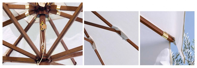 Ombrellone a palo centrale con testata a 8 stecche, apertura a doppia carrucola con fune in poliestere e nylon, camino antivento e tiranti in acrilico con doppia borchia in ottone nichelato.