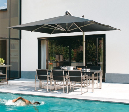 Struttura in alluminio quadrata 7,6x7,6 cm verniciata, apertura con manovella, possibilità d'inclinazione dell'ombrellone aperto, rotazione di 360° intorno alla base. Le stecche possono essere sostituite singolarmente senza smontare la struttura. Con un unico movimento l'ombrellone si chiude di fianco al palo evitando di dover spostare i mobili sottostanti. Copertura: quadrata 350x350 cm, rettangolare 300x400 cm, ottagonale Ø 400 cm. Nella misura rettangolare 300x400, su richiesta, può essere montato l'ombrellone ruotato di 90° rispetto alla versione standard. Base acquistabile separatamente. Peso minimo da porre sulla base: Kg.200